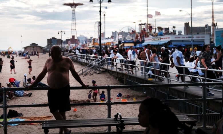 People gather along the Coney Island boardwalk on a warm day.