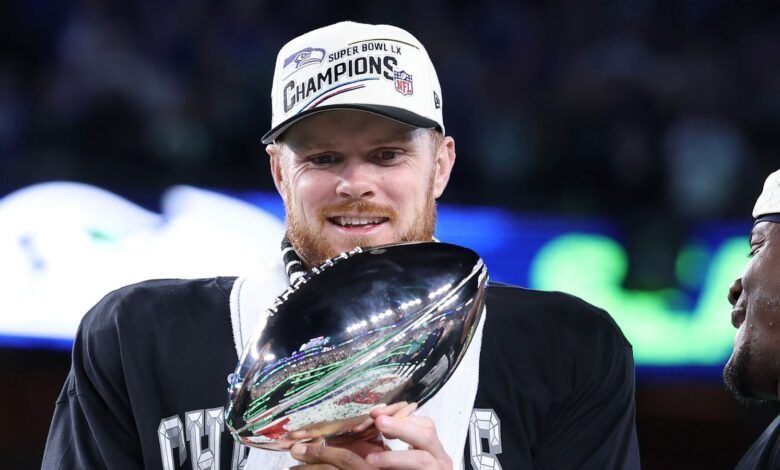 Uchenna Nwosu scored a 44-yard interception return, Darnold threw a touchdown pass to AJ Barner, Jason Myers kicked a Super Bowl-record five field goals and Julian’s Love fourth-quarter pick extinguished any threat of a Maye fightback.